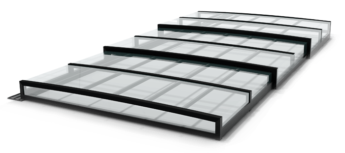 - Extra flache Glasüberdachung mit teleskopischer Verschiebung